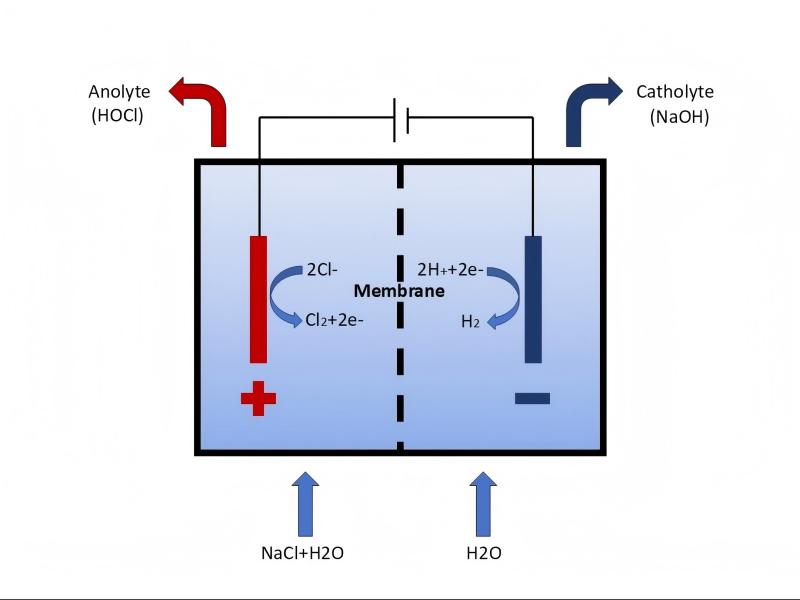 By adding low-concentration sodium chloride to softened water and conducting an electrochemical reaction through electrolysis in a diaphragm electrolyzer, an acidic aqueous solution with hypochlorous acid as the primary bactericidal component is generated.